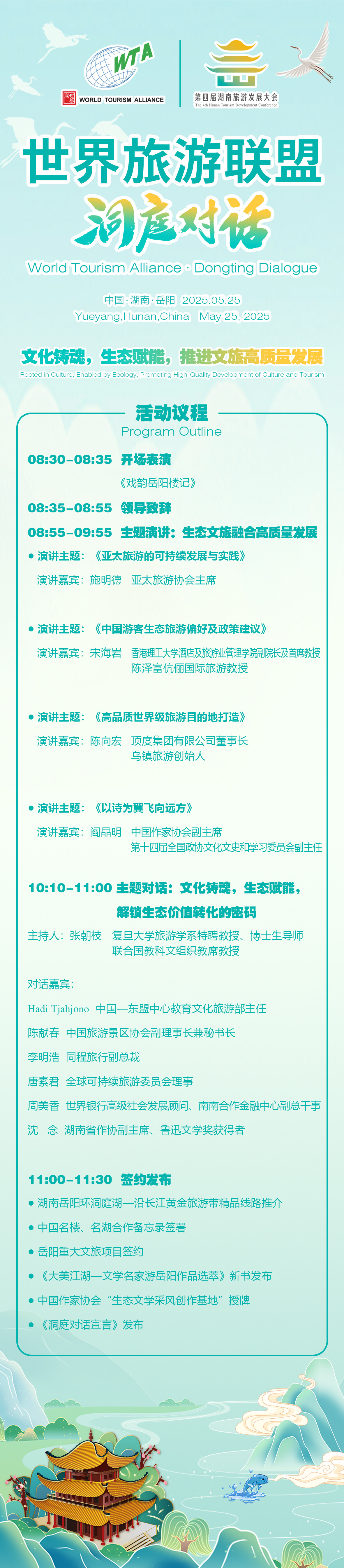 作为第四届湖南旅游发展大会系列配套活动之一2025世界旅游联盟·洞庭对话活动文化铸魂,生态赋能,推进文旅高质量发展为主题,邀请来自全球旅游组织、国际文旅机构、文旅研究机构、文学艺术组织、知名文旅企业等领域的中外嘉宾,聚焦主题演讲、主题对话、签约发布等环节,深度挖掘文化+生态+旅游融合路径,充分展示岳阳深厚的文化底蕴和丰富的生态资源,全面塑造洞庭湖生态文旅标杆形象,为全球提供文旅与生态协同发展的中国智慧。活动日程如下: