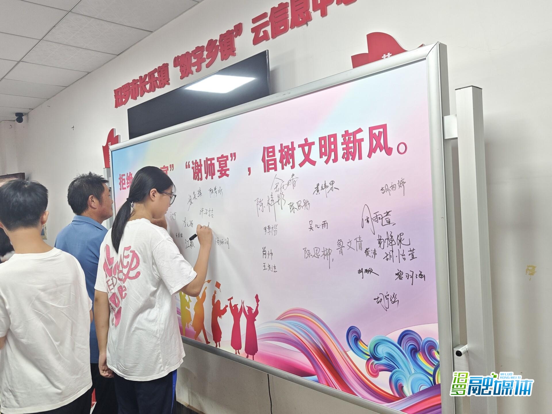 会前,全体学子在“拒绝‘升学宴’‘谢师宴’ 倡树文明新风”签名墙上郑重签名,镇新时代文明实践所向与会家长及学生发放倡议书,倡导以简朴形式庆祝升学,抵制铺张浪费之风。
