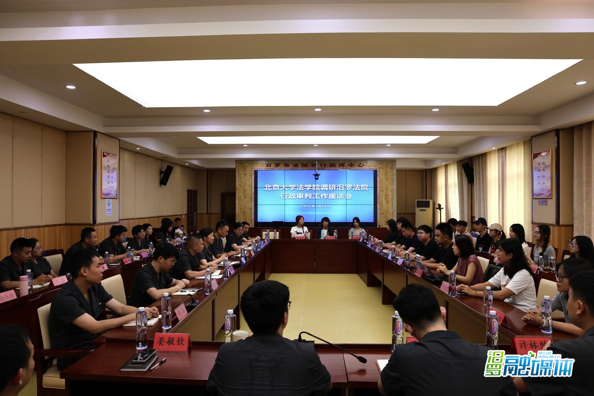 实践团首站走进汨罗市人民法院。在庄严肃穆的审判庭内,师生们现场旁听庭审,“沉浸式”体验司法审判流程,上了一堂生动的庭审观摩实践课。在随后召开的座谈会上,汨罗市人民法院相关负责人系统介绍了该院行政审判工作的基本情况与特色举措。法院青年干警与北大师生还围绕法学论文写作展开深入交流,分享实务经验与学术思考。