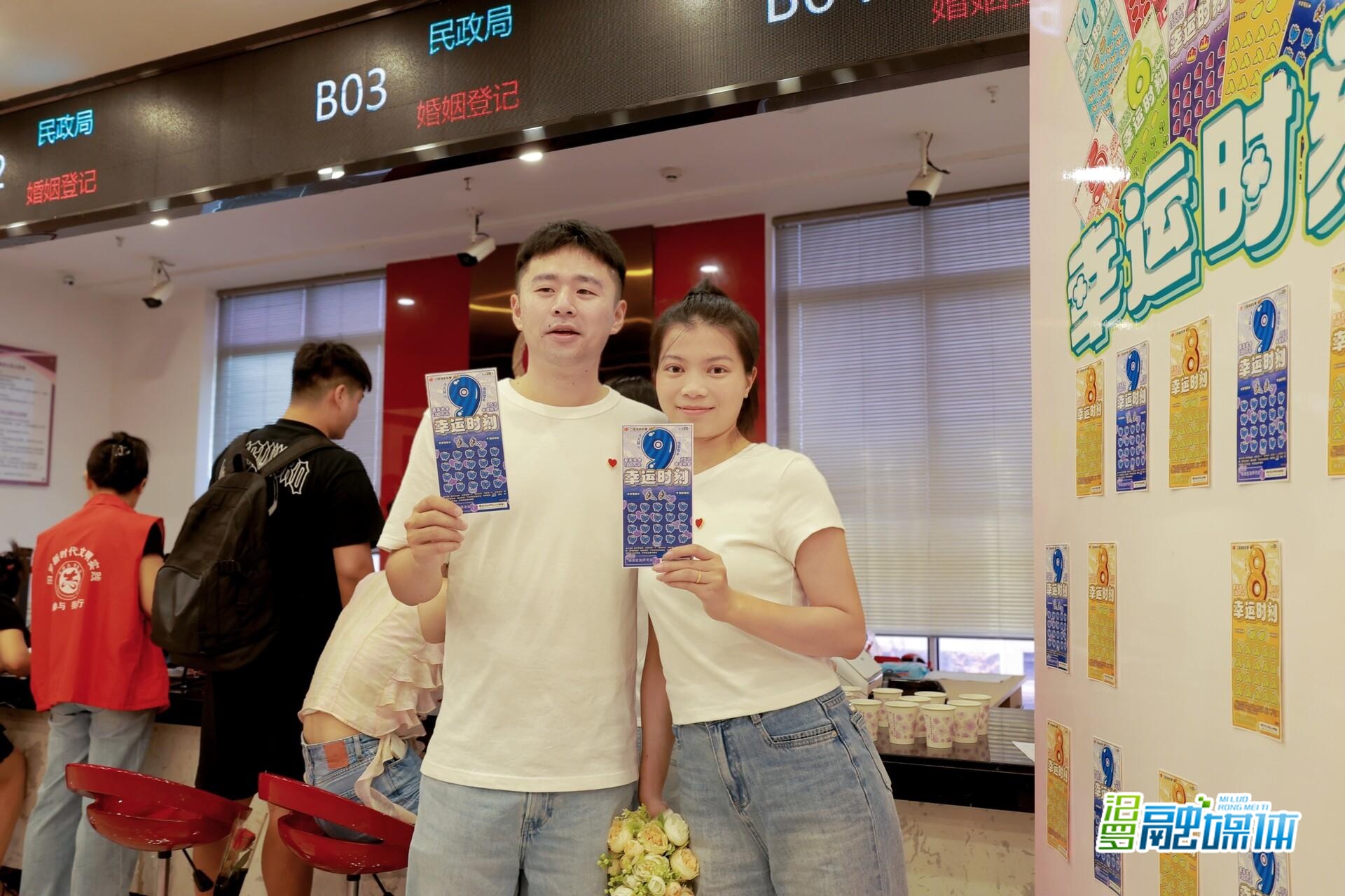 现场布置着“七夕”主题打卡背景和粉白色气球,氛围温馨又喜庆。 在志愿者的引导下,新人们有序完成登记流程,领取结婚证,走上颁证台合影留念,并共同宣读结婚誓言。在特邀嘉宾的见证下,新人们聆听了关于幸福婚姻的经验分享,签订了“婚事新办”承诺书。汨罗市民政局党组成员、副局长彭旭汉为新人送上伴手礼和诚挚祝福,每个环节都充满温馨与仪式感。此外,汨罗市福彩中心还为每对新人准备了2张彩票,寓意“七夕添喜”,总价值达7700元,让这份甜蜜时刻多了一份惊喜。