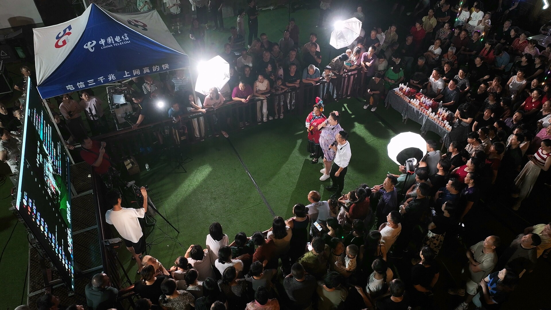 随后,曾参加汨罗江大舞台乡镇擂台赛的长乐镇战队队长艾咏担任主持人,他登台献唱多首动人歌曲,迅速点燃全场气氛。当晚演出阵容多元,不仅汇聚长乐镇的民间歌手,还特邀屈子祠镇的嘉宾助阵。活动同步进行线上直播,观众纷纷点赞留言,线上线下热烈互动。现场更设有“全民K歌”报名区,喜爱唱歌的群众可现场报名,准备好曲目后由主持人适时邀请登台,让普通群众也体验一把“歌手瘾”。