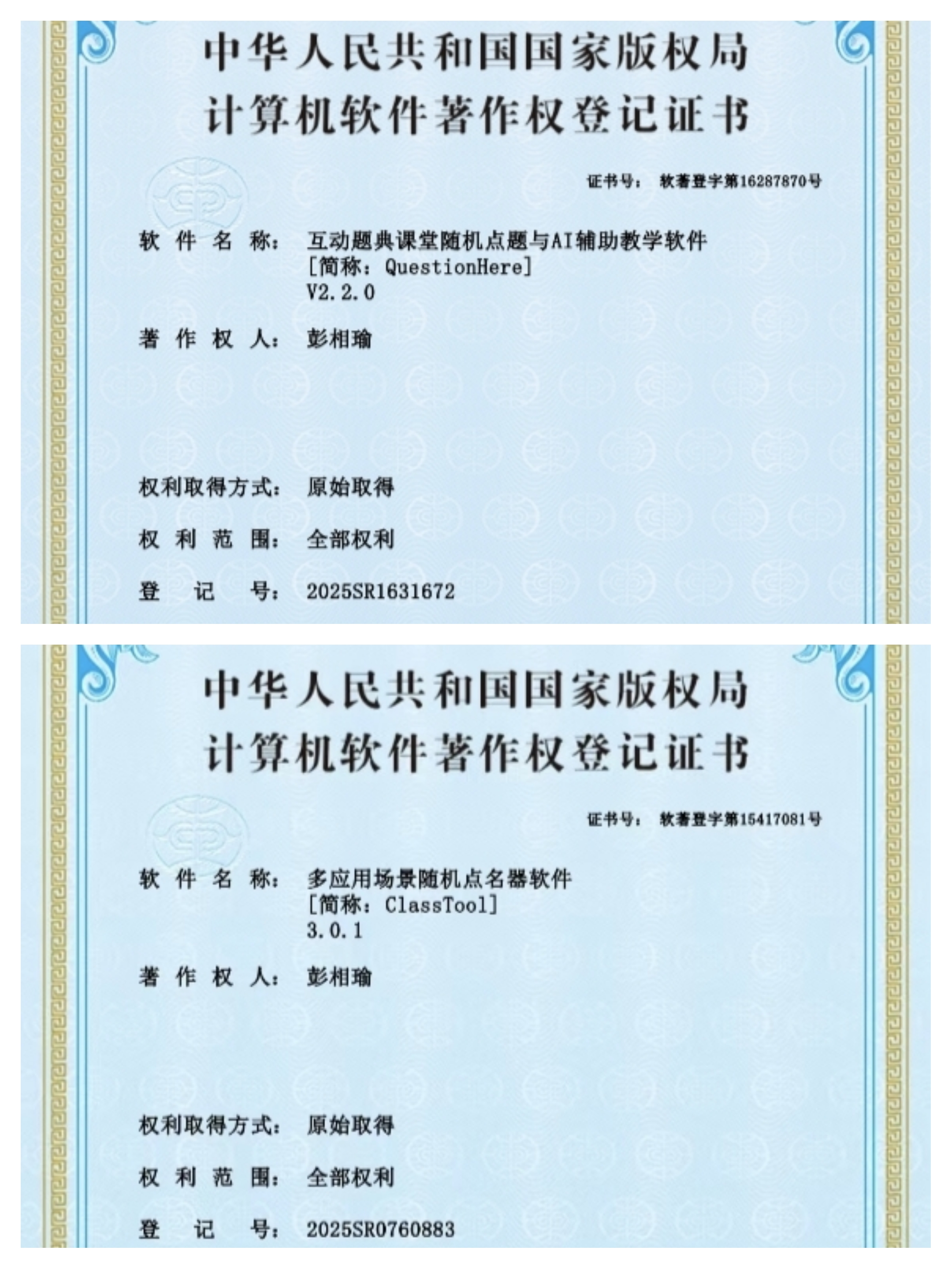 汨罗融媒体讯(记者 甘芳芳 通讯员 章莉)近日,汨罗市职业中专学校传来喜讯——该校17岁的学生彭相瑜两度获得国家计算机软件著作权证书。他独立设计开发的“随机点名器”和“互动题典”两款教学软件,目前已被多个学科的教师广泛应用于实际课堂教学。如今,他已成为全校皆知的“软件开发小专家”。