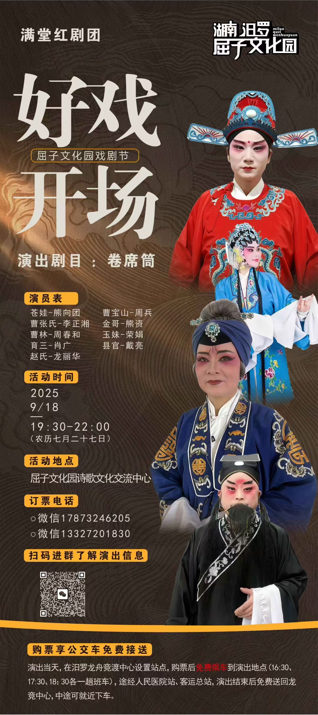 此次演出不仅是一次文化惠民的实践,更是非遗走进现代生活、文旅融合赋能传统艺术的生动体现。线下购票可前往屈子文化园游客中心戏票订购处;线上订票敬请拨打电话或添加微信: 17873246205(何)。