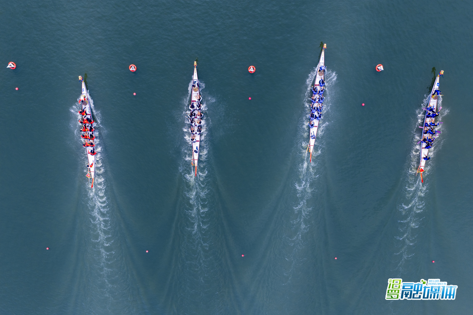随着发令枪响,龙舟如离弦之箭划破江面,船头鼓手节奏铿锵,桨手们动作整齐划一, 一道道激昂的水痕在汨罗江上不断延伸。