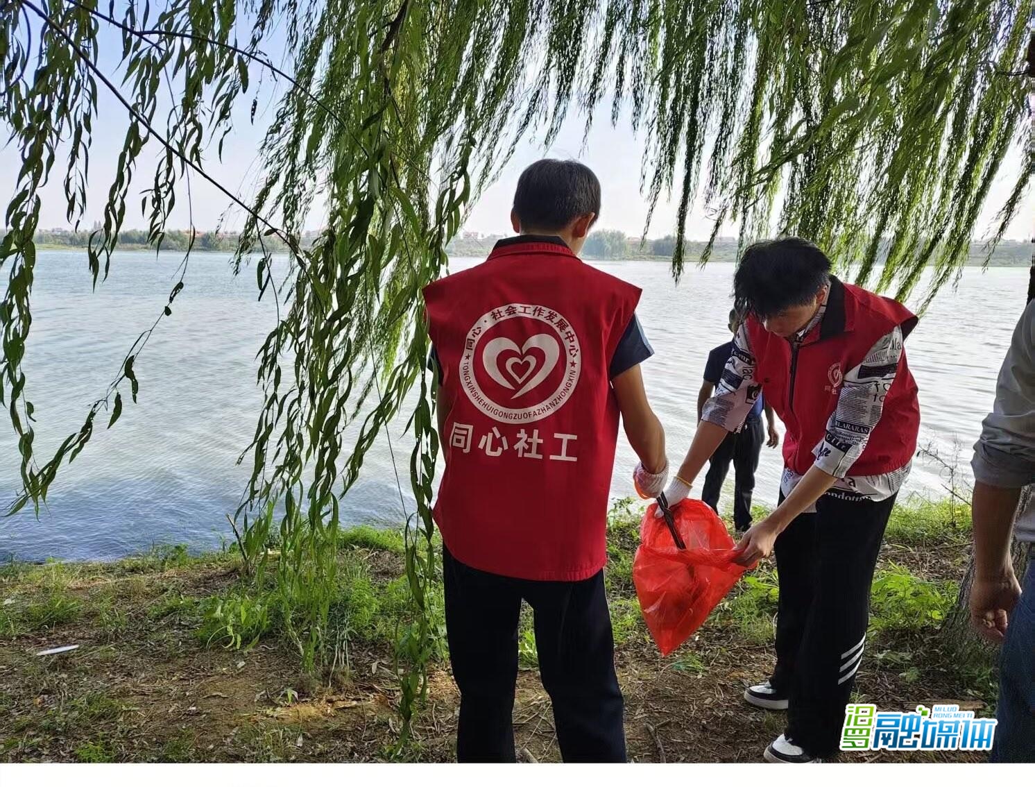 学生志愿者清理江边垃圾