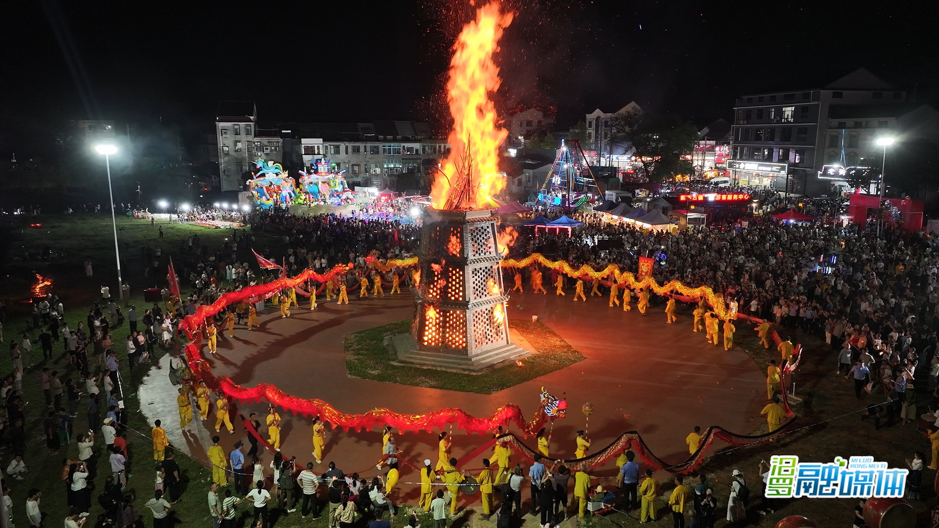 “快看!塔火亮起来了!”祭塔仪式后,烧塔狂欢如期而至。干柴燃起,火焰自塔身孔洞喷薄而出,橙红色的火光霎时映亮夜空,引来围观群众阵阵欢呼。居民与游客纷纷绕塔而行,祈福生活红红火火、团圆美满。紧接着,两条“彩龙”围绕着熊熊燃烧的宝塔欢腾起舞,现场锣声激昂,场面热烈欢腾。