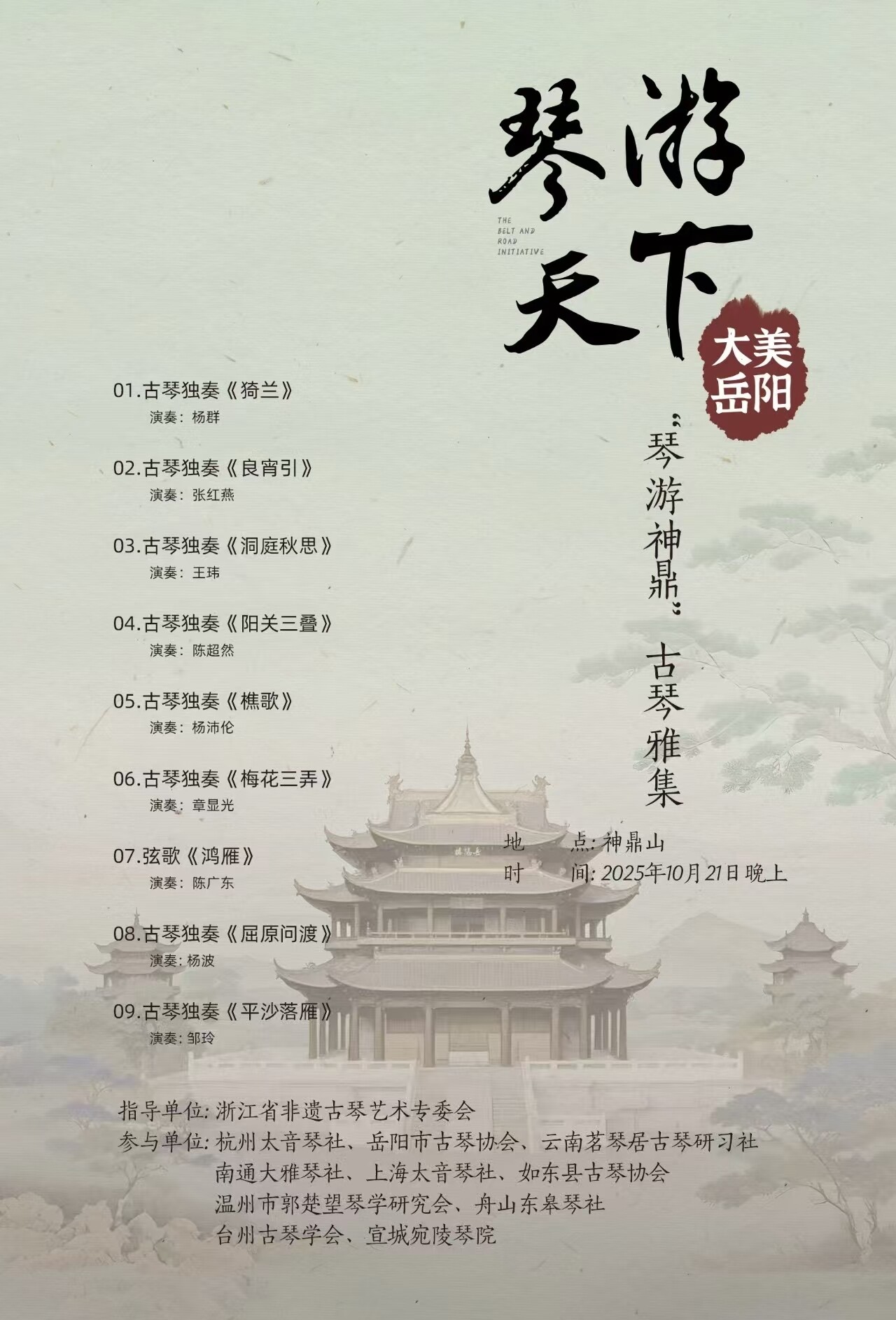 汨罗融媒体讯(记者 王洁)为进一步提升城市文化活力、促进文旅消费,打造独具魅力的古琴文化名片,由岳阳市委宣传部、岳阳市文化旅游广电局主办的“琴游天下·大美岳阳”杭岳古琴文化交流活动将于10月20日至21日走进汨罗。活动特邀浙江省非遗保护协会古琴专业委员会、杭州太音琴社、岳阳古琴协会等单位的古琴名家联袂演出,市民可免费参与,共赏琴韵。