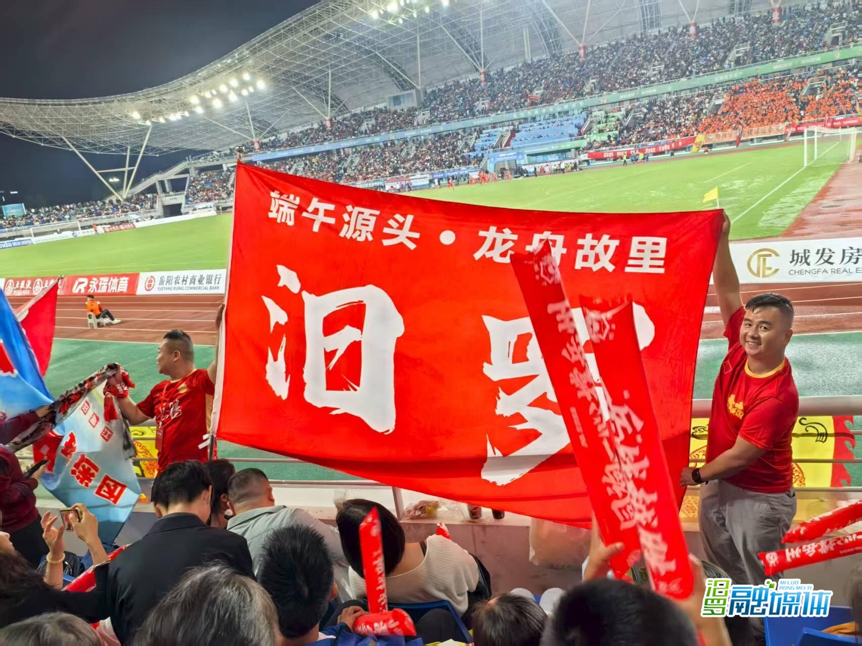更令人动容的是,每场比赛中,汨罗球迷都会精心准备带有汨罗元素的横幅、纸板等道具。“品粽子 赛龙舟”“喝甜酒 看故事”“亲‘汨’一次 甜‘汨’一生”“端午源头 龙舟故里”等标语与“岳阳队加油”的助威横幅相映成趣,不仅传递着对岳阳队的支持,也让汨罗的地域文化在赛场得以展现,成为湘超赛场上一张特殊的“汨罗名片”。