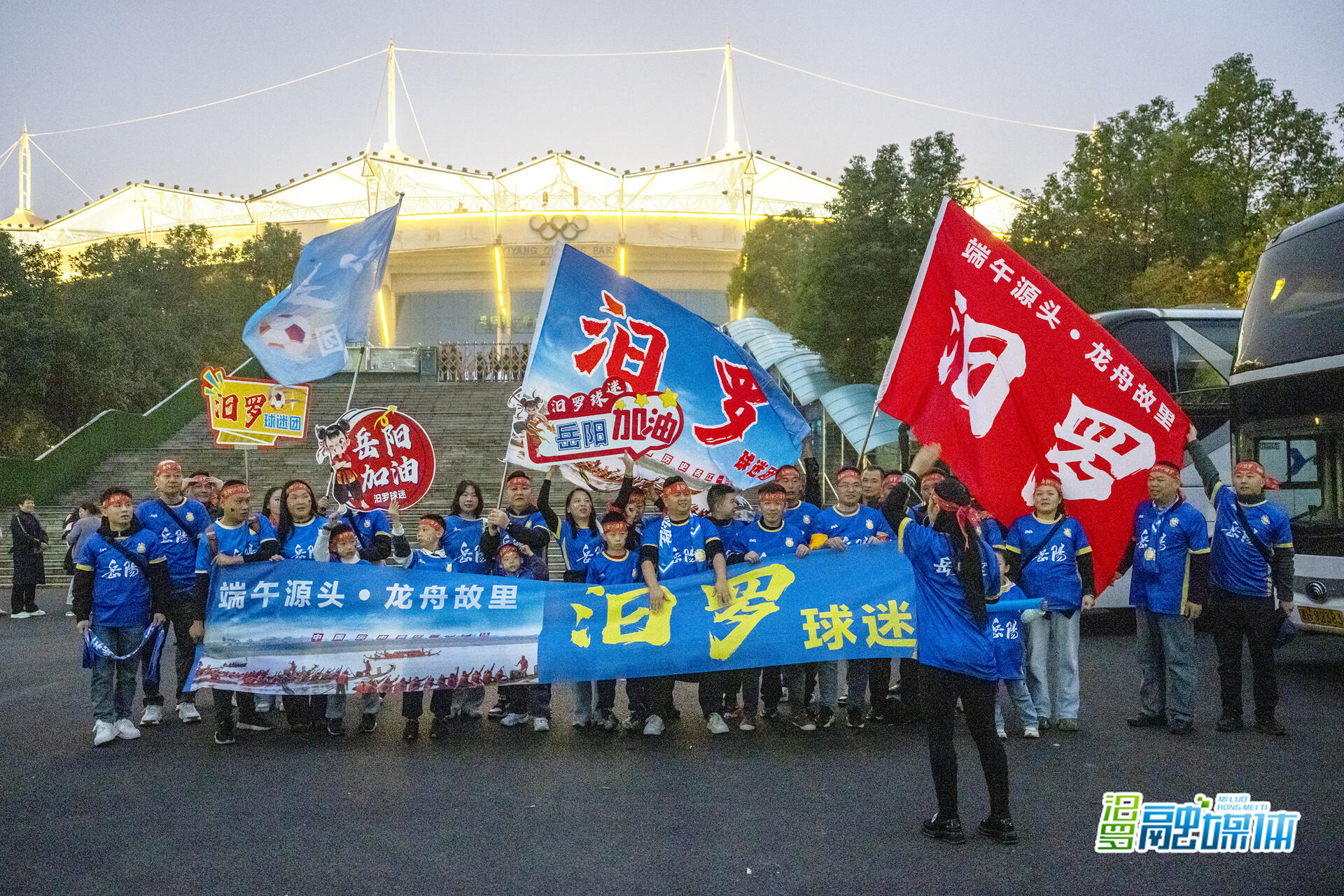 当晚,汨罗球迷身着统一服饰,手中高举助威旗帜,头上佩戴的头巾印着 “岳阳”“汨罗” 字样,成为赛场边一道独特的风景线。比赛期间,他们齐声喊出助威口号,挥舞着手中的加油道具,用饱满的热情为岳阳队加油鼓劲,即便身处客场,也让赛场充满了 “主场氛围”。
