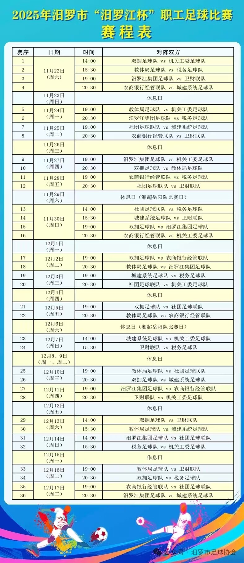 汨罗融媒体讯(记者 甘芳芳 姚望)绿茵点兵,逐梦赛场!11月22日下午,由汨罗市总工会主办、汨罗足球协会承办的2025年汨罗市“汨罗江杯”职工足球比赛,在沿江大道足球场正式拉开帷幕。9支职工劲旅整装集结,36场赛事即将逐一上演。