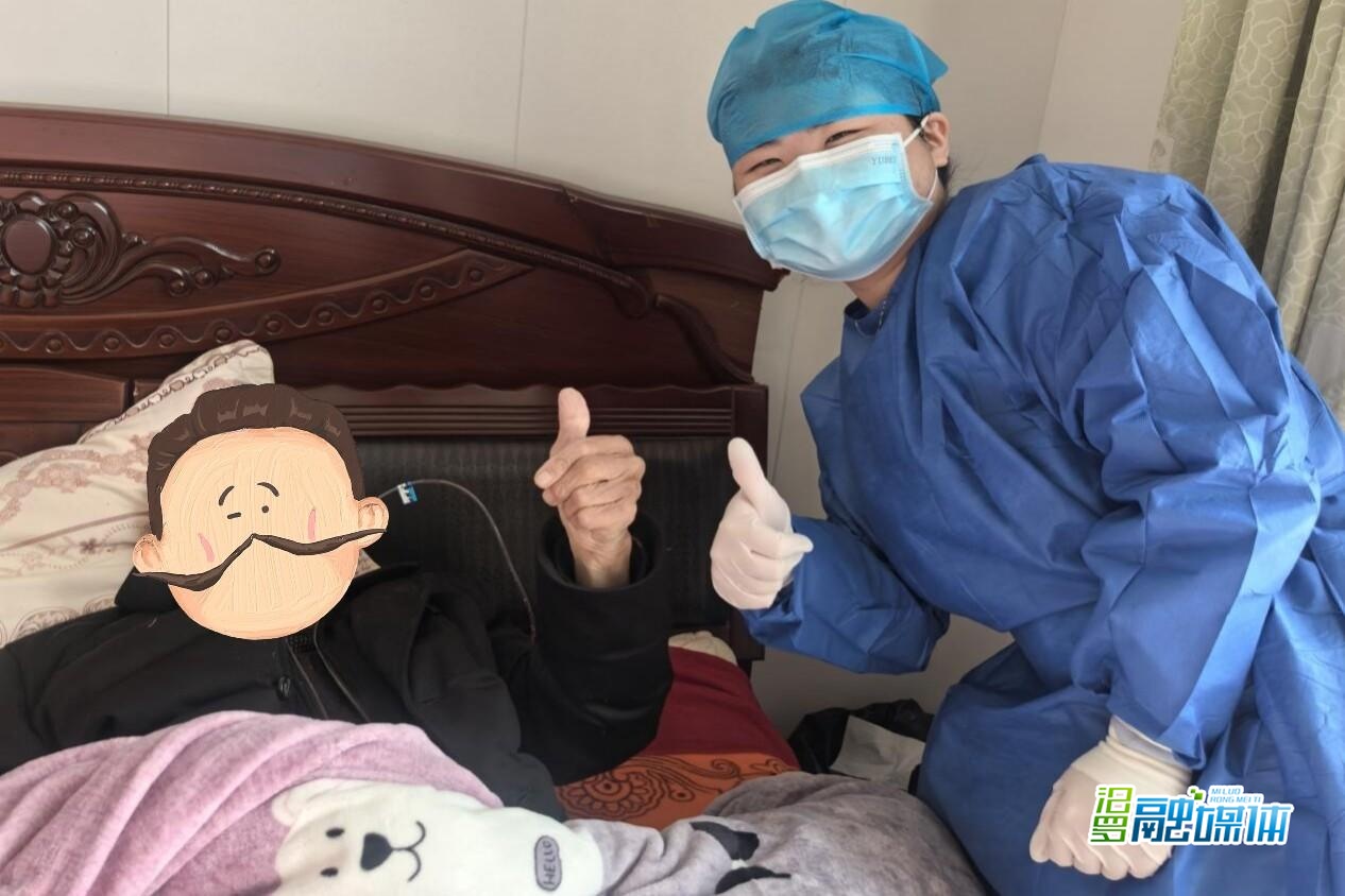 随后,一同上门的护士杨婷向家属详细讲解了鼻饲喂养的注意事项,包括进食姿势、流速控制、管道清洁等日常照护要点。尽管卧床虚弱,老人仍努力抬起手,向护士竖起大拇指。家属感动地说:“真没想到,在家就能享受到这么专业的护理,真是帮我们解决了大难题!”