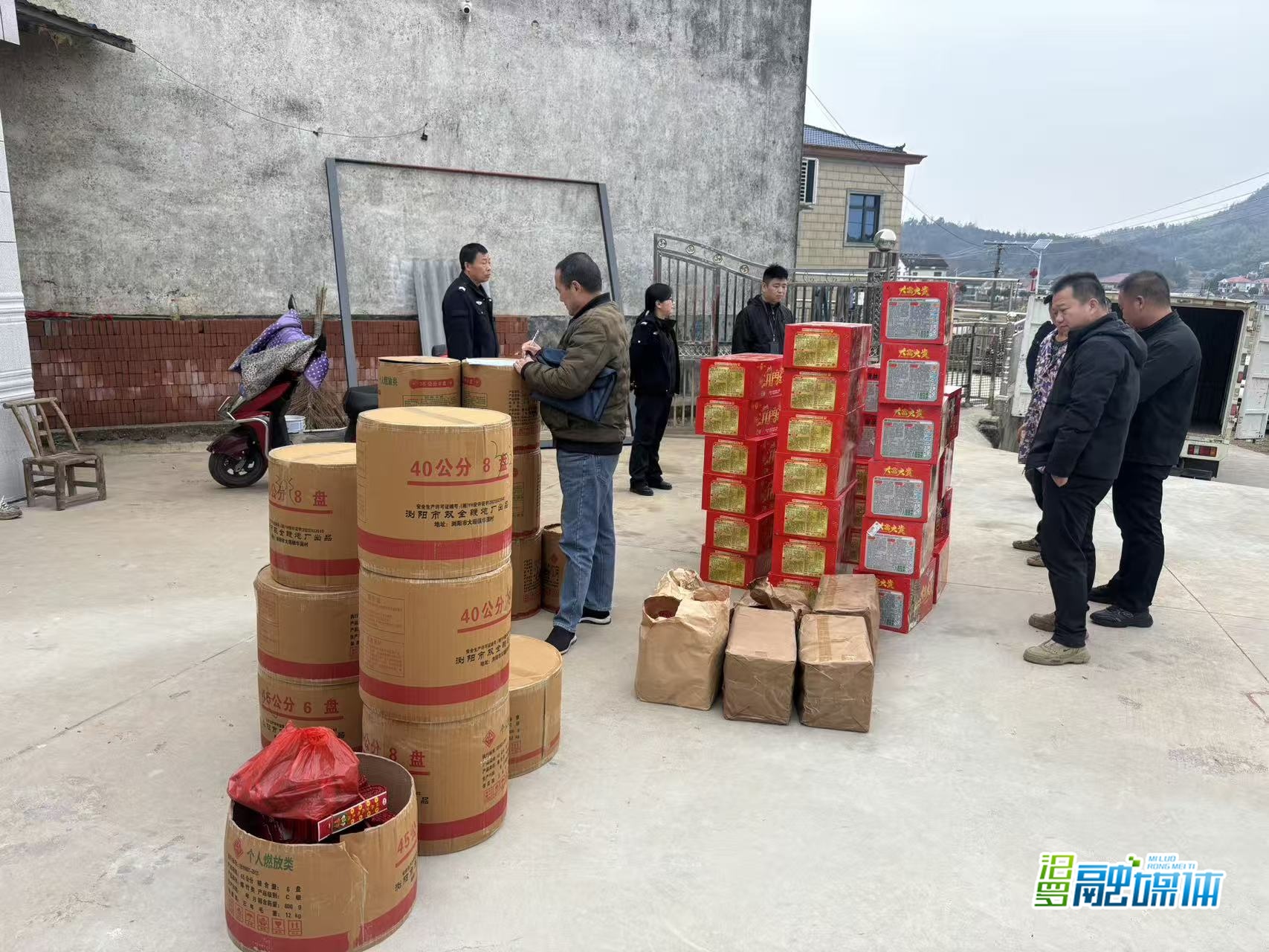 2月3日中午,神鼎山镇接群众举报,称丰仓村一户居民家中涉嫌私自存放烟花爆竹。镇应急管理组、综合行政执法大队及辖区派出所立即启动联动机制,赶赴现场核查,在该居民车库内发现非法储存花炮31箱、鞭炮27件。该存放点环境不具备安全条件,存在严重公共安全隐患,执法人员当场依法全部收缴涉案物品,并于当日完成销毁,同时对当事人进行严肃批评教育,督促其签订相关承诺书。