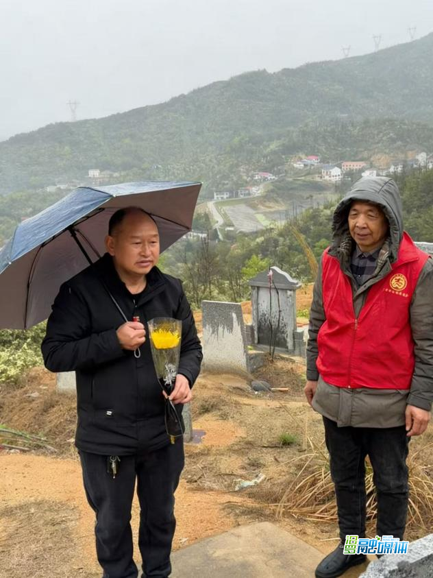 志愿者冒雨在公墓入口开展“鲜花换鞭炮”服务,引导群众文明祭扫