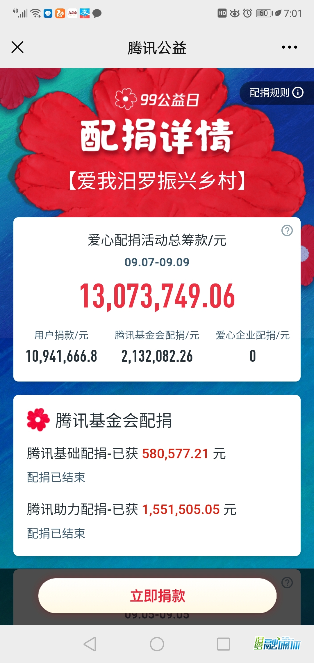 汨罗融媒体讯(记者 夏凡)9月9日,由汨罗市慈善总会在腾讯99公益平台申报通过的“慈心善举情暖汨罗”和“爱我汨罗振兴乡村”公益募捐项目的爱心配捐活动结束,三天时间内,两个项目合计筹款2620余万元,其中,用户捐款2189万余元(截至9月9日晚7时许),腾讯基金会配捐431万余元。