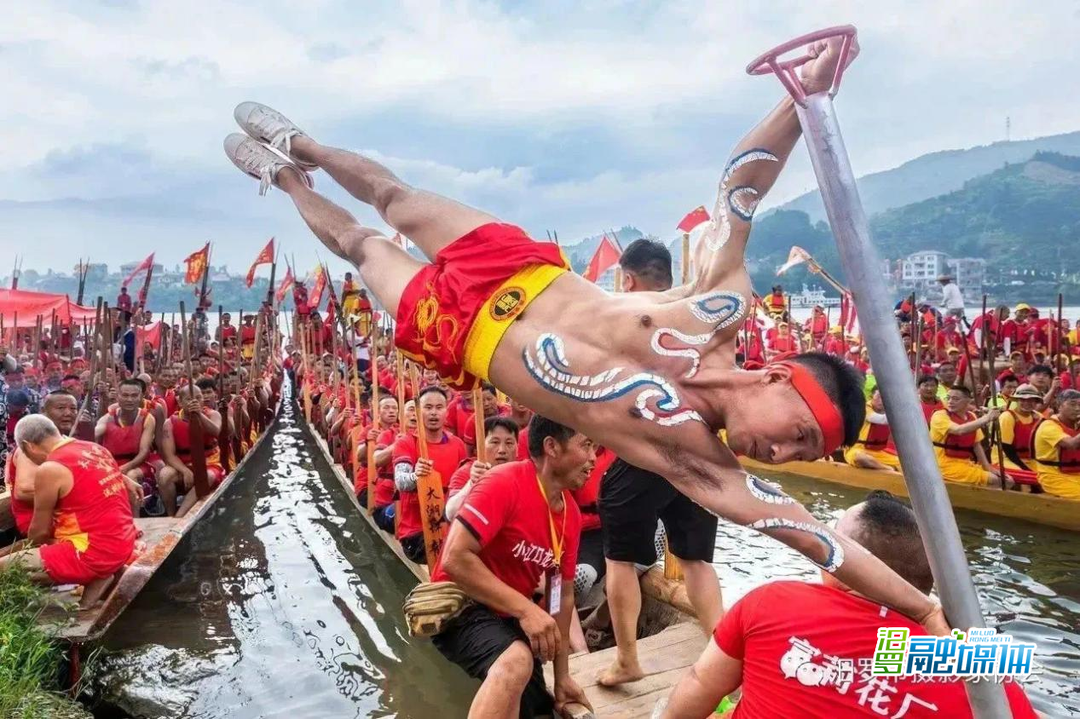 我有一个疑问,这么多龙舟聚在一起,为荣誉而赛,但当地对安全管制似乎较为宽松,为何如此心大?抱着这个问题,我咨询当地民俗专家张昌竹,他说2006年,大江口组织龙舟比赛,因比赛激烈,发生了翻船死人的事故,之后政府采取断然措施,收缴所有龙舟。当时的大江口人,家家如丧考妣,有个龙舟队长,在龙舟收缴前,于江边抱着龙舟哭了整整一夜。一直到2017年,在大江口人的强烈要求下,政府终于同意恢复龙舟赛,这之后他们汲取教训,友谊第一比赛第二,加之大江口人从小在江里浸泡长大,水性很好,所以我们看到的龙舟队员在表演时不穿救生衣,光着膀子就干,体现一种原始的美。