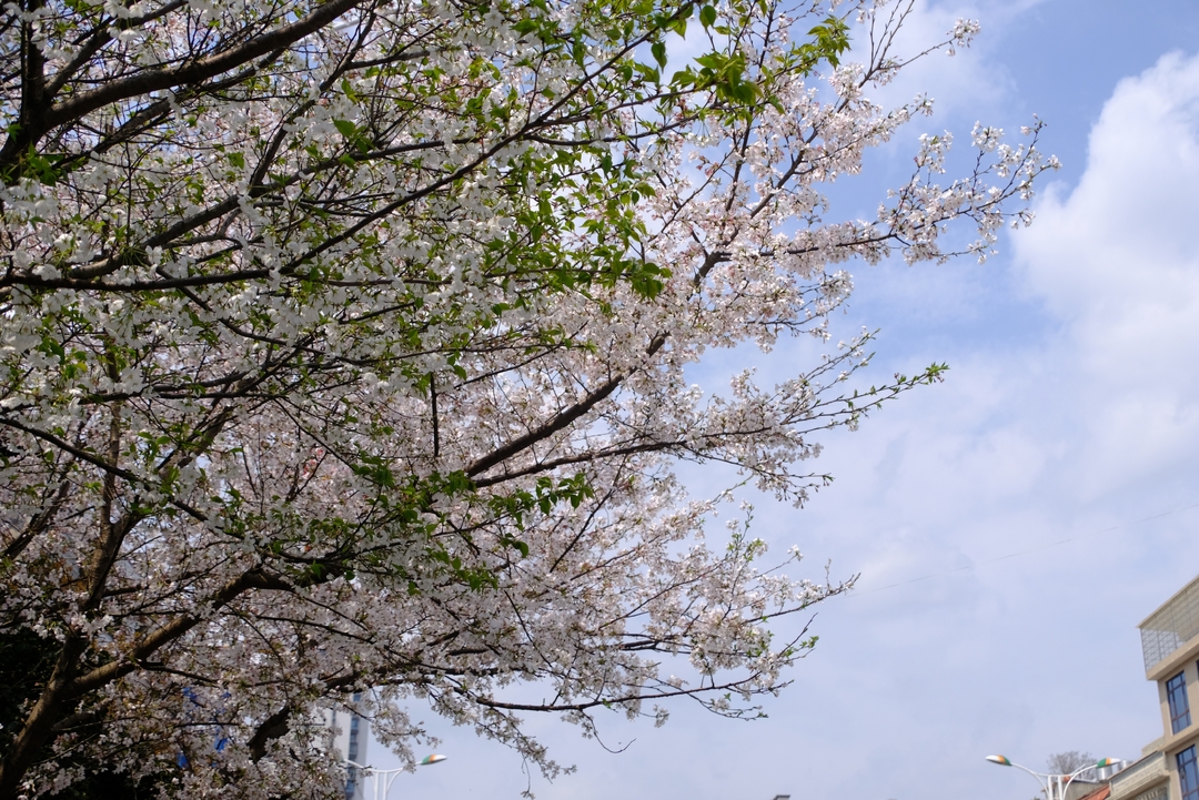 在汨罗城区的罗城大道和归义广场,两片樱花树虽数量不多,却开的正好。千万朵粉白的樱花开得密密匝匝,满树烂漫,如云如雾缭绕在枝头,组成了春天别样的风情。